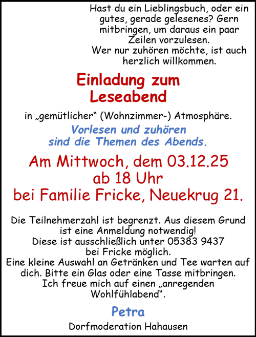 im Dorfgemeinschaftshaus in Hahausen ganz in der Nähe der Kirche