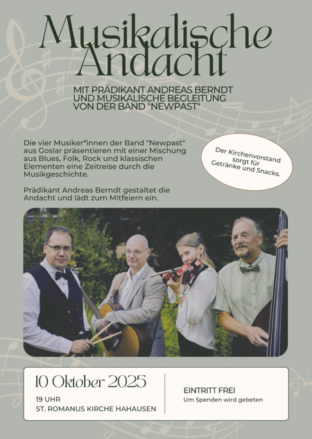 19.00 Uhr Andacht (Pädikant Berndt) mit Musik der Band "Newpast" in der St.